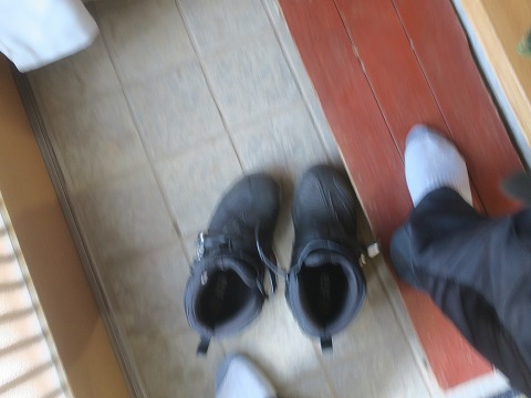 11:39 靴を脱いで 店の前の駐車スペースにバイクを駐めたら、さっそく入店。 靴を脱いで上がる造りのお店です。 靴下に穴は開いていませんでした。(笑) 店内ではすでに先客一組が食事をしていました。 店内は4人掛けのテーブル席が2卓と、小上がりに大きなテーブルが一つ、老夫婦が営むこぢんまりとしたお店です。 |