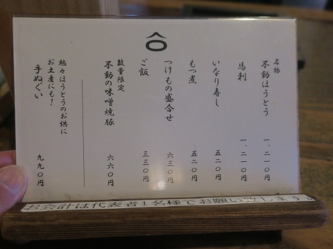 18:00 注文は 店内は空いていました。 昼食の時間は混んでいる記憶がありますが、夕食時はね。 河口湖周辺だと、泊まりの観光客は宿泊先で食べるだろうし、日帰りの人たちは、もうすでに引き上げている時間になると思いますので。 さて、注文は”ほうとう”。 ほうとう不動には、メインは”ほうとう”しかありません。 河口湖周辺にあるほうとうを供する2大巨頭としてはここ”ほうとう不動”と”ほうとう小作”。 ほうとう小作はほうとうに鴨、豚、猪、熊肉等様々なトッピング バリエーションを設定しているのに対して、ほうとう不動は”ほうとう”単品のみの潔さ。 |