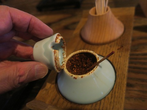 18:16 すりだね 汁にカボチャの甘味が溶け込んでいるので、汁に喝を入れるために”すりだね”。 富士吉田発祥らしいです。 唐辛子ベースの辛み調味料で、味変が楽しめます。 器が富士山。 つま楊枝の器も富士山。 つま楊枝の器は、つま楊枝が噴火した富士山を表しています。(?) すりだねは”吉田のうどん”のお店では必須の卓上調味料ですね。 |