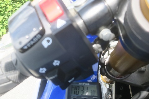 10:37 気温は 一番涼しいはずの場所で気温を確認。 バイクに貼り付けてある時計兼温度計を確認すると、見難いけど30℃。 実際はエンジンからの排熱で2℃程高く表示されるので、28℃くらいかな。 28℃でも涼しく感じます。 |