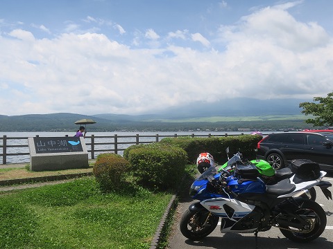 10:51 見えない富士山を 三国峠を下りて、山中湖へ反時計回りに走って、途中にある駐車場で一休み。 見えない富士山をバックに写真を撮ります。 まあ、山中湖が見えているからいいか。(笑) 駐まると暑いです。 標高が高く、夏場は涼しいので、大学のテニス部の夏合宿とかでよく利用される山中湖周辺ですが、この気温だと避暑にはならんですね。 |