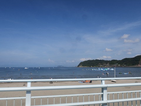 8:49 逗子海岸 自宅のある横須賀を出発して西走。 湘南の海沿いを走る国道134号線に入り、毎度の逗子海岸までやってきました。 空気が澄んでいる冬場であればクッキリ見える富士山ですが、今日は靄っていて見えません。 夏場の正常な気候です。 江の島がようやく見える程度かな。 |