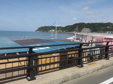 9:23 西湘バイパスに 国道134号線で江の島を過ぎると、海岸線と国道との間には防砂林が続き、しばらく海の景色とはおさらば。 134号線を大磯町まで西走して、その後、国道1号線の西湘バイパスに上がり西走を続け、大磯ロングビーチ脇を通過中です。 昔はタレントの水泳大会の会場になることが多くあった大磯ロングビーチにもたくさんの人が出ていました。 ※ いつもより海の写真を多めに載せてみました。(笑) |