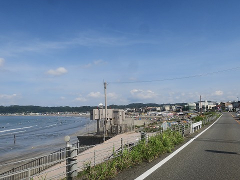 8:49 海の家が 逗子海岸をしばらく走ると、海岸沿いには海の家が立ち並んでいます。 砂浜にもたくさんの人が出ていましたが、海の家の陰になっちゃって見えませんね。 |