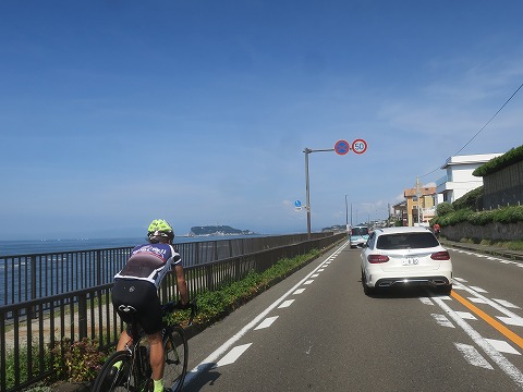 8:57 七里ガ浜(しちりがはま)に さらに国道134号線を西走。 稲村ケ崎を過ぎると、徐々に江の島が近くに見えてきます。 稲村ケ崎から先、七里ガ浜はしばらく遊泳禁止区域で、サーフィンをしている人がたくさんいます。 夏場になって、やっぱりクルマの台数が増えている感じです。 今の時間だと渋滞と言うほどではありませんが、夏の期間中はできれば避けたい区間ですね。 |