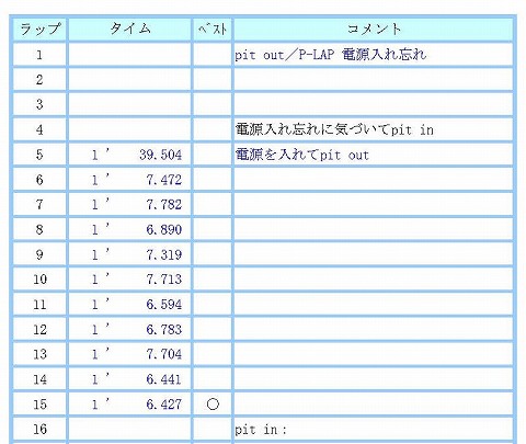 8:00〜8:20 B1クラス 8時になって今日1本目の走行が始まりました。 電池を入れ替えた時計の時間がまだ正確じゃなくて、コースインの時間が遅れちゃいました。 コースインした時点で、先にコースインしたバイクがホームストレートに戻ってくるタイミングになっちゃいました。 3周くらい回って、「今日はどのくらいのペースで走っているのかなぁ」と思ってP-LAPを見たら、電源入ってなぁ〜い。 (-_-;) 今日はタイム優先で走らないから「タイムはわからなくてもいいかなぁ。」 と思ったけど、やっぱりタイム計測はしたい。 走行中にP-LAPの電源を入れるのは危ないので、4周回でピットインします。 ピットインしたら、ピットロード上でP-LAPの電源を入れて、止まらずにそのまま再度コースインします。 6周目からタイム計測が出来て、走行を続けます。 気温は高いですが、曇っているので太陽光線で暑くなることがないので、晴れのときより楽みたい。 毎度、徐々にタイムを詰めて、最終ラップにこの回のベスト、6秒4でチェッカーです。 |
