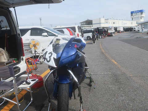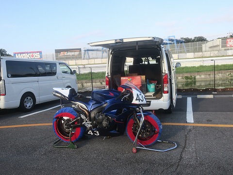 6:07 いつもの場所じゃない いつも駐めることが多いS字裏はすでに一杯で駐めることが出来ませんでした。 ちょっと先まで進んで、最終コーナーの立ち上がり、イン側の駐車スペースが開いていたので、そこにハイエースを駐めます。 場所が決まったら、CBRを下ろして走行の準備をします。 |