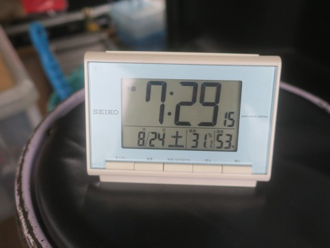 7:46 気温が 走行15分前になりました。 革つなぎに着替えます。 時計の温度計を見ると31.2℃。 まだ8時前なのにね。 |