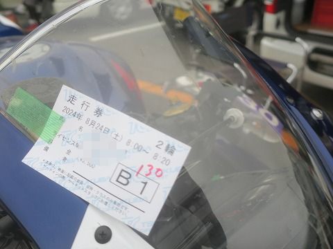 7:31 走る準備を 暖気が終わったら、買ってきた走行券をコースインゲートで渡しやすい様に、スクリーンに貼り付け。 暖気用に入れておいた前回のガソリンの残りを抜いて、今日買ってきたばかりのガソリンに入れ替え、走る準備を進めます。 |