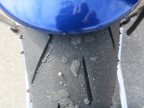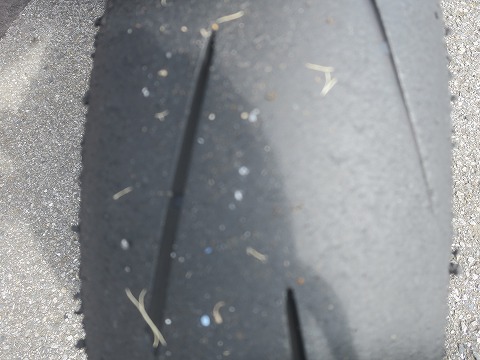 8:33 走行後のリヤタイヤ 走行後のタイヤの状態を確認。 ピンぼけ。(-_-;) はっきり写っていませんが、暑さの割りに悪くない感じです。 (走行後に路面温度を確認したら、それほど上がってなかったんですね。) |