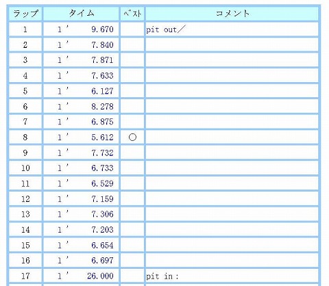 7:56 今日はコンスタントに さて、走るにあたって今日のお題。 前回は楽しく走ることでしたが、今回は”コンスタントに”走ること。 タイムを出すためにチャレンジングなことは今日はしません。 「違う魚を釣ろうと思ったら違う仕掛けを・・・」と言われるように、同じ走り方を一生懸命していてもタイムは上がりません。 タイムを上げようと思ったら、違うチャレンジをしてみないとです。 けど、自分レベルだと、まず毎週同じように走ること自体ができてません。 なので、今日のお題は、”コンスタントに走る”です。 別にスローペースで走るってことじゃありませんけど。 それでは、ぼちぼち時間になったので、タイヤウォーマーを外して、コースインの準備をしましょう |