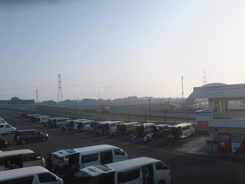 6:50 いつもの土曜日 販売所に並んでいる間に、パドックを眺めてみるといつもの土曜日の風景です。 霧は無くなりましたが、水蒸気が多くて視界が悪く、20kmほど先にある筑波山は見ることができません。 走行券の販売は7時からですが、今日は直射日光が強くて、肌が暑いです。 |