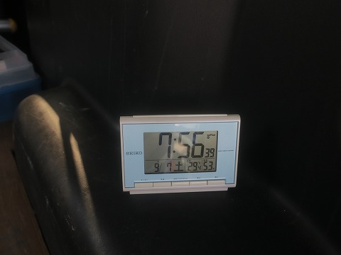 7:56 気温は 走行15分前になって、革つなぎに着替え。 走行5分前を切りました。 時計の温度計を見ると29.4℃。 ようやく30℃を切るようになってきました。 と言っても、十分に暑いけどね。 |