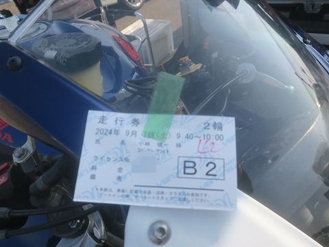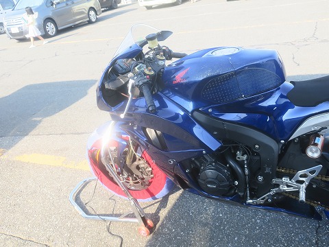 7:25 走る準備 ライダースブリーフィングと軽いストレッチ運動が終わってCBRのところに戻ってきました まずは朝一の暖気。 暖気が終わったら、さっき買ってきたフレッシュなガソリンに入れ替えます。 20分の走行で使うのは5リットルくらい、ガス欠症状が出ないようにプラスで2リットルの計7リットルをタンクに入れます。 |