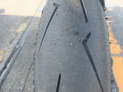 8:27 1本目走行終了 1本目の走行を終えてパドックに戻ってきました。 いの一番に走行直後のタイヤのエアー圧確認。 エアー圧の確認をしたら、走行後のタイヤの状態を確認。) 前回もそうでしたが、路面温度が45℃くらいでも、このタイヤ大丈夫みたい。 もちろん自分のレベルでの話ですが。 タイヤのエアー圧は、走り始めより流石に少しだけ上がってましたね。 次の走行の時はもう少し下げてみましょう。(わからんけど) |