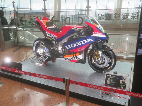 10:11 展示してあるのは 出発ロビーに到着すると、HONDAのMotoGPマシンのRC213Vが展示してありました。 カッコイイですね。 持っていけそう。 持っていっちゃいたくなります。(笑) |