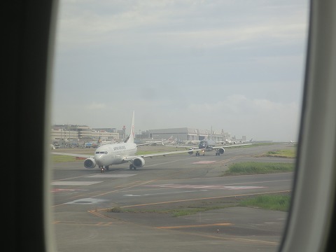 12:26 順番待ち 飛行機に乗ったら乗ったで、離陸待ちです。 羽田、混んでますね。 窓の外には離陸の順番待ちの飛行機が並んでいます。 羽田空港はちょっと過密すぎる感じがしますね。 日没時に羽田空港近くの首都高速を走っていると、これから着陸する飛行機が4機も5機も空に列を作って飛んでいるのを見かけることがあります。 |