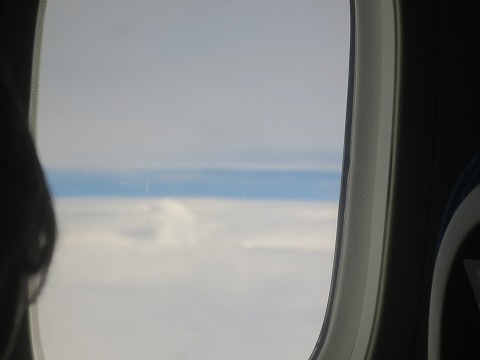 13:32 ずーっと 離陸して約1時間、ずーっと曇り。 せっかくの旅行なので天気が良くなるといいなぁ。 |