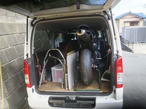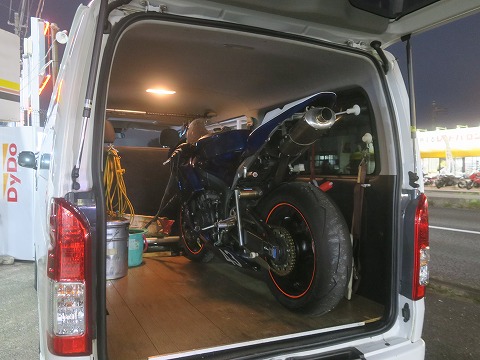 17:55 積込んで 最後にCBRをハイエースに積込んで。 午後の1時半くらいから初めて、今は6時。 それなりに時間かかっちゃいましたね。 それでは、自宅に帰ることにします。 「お疲れ様でした。」 チャタリングが消えたかどうかは、次回の筑波走行の時に確認ですね。 (おわり) |