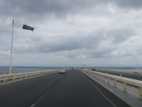アクアラインを渡る アクアラインのトンネルを抜けて、橋の上を走ります。 風、強し。 吹き流しがほぼ真横になっているので、風速 10m近くあるみたいです。 車高の高いハイエースは横風で不安定ですぜ。 |
