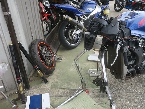 14:14 不要なものは とりあえず不要なものは外せたかな。 このあと、三又を外すので、フロントのレーシングスタンドは使えません。 さて、どこでフロントを支えるスタンドを通しましょうか? |