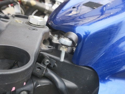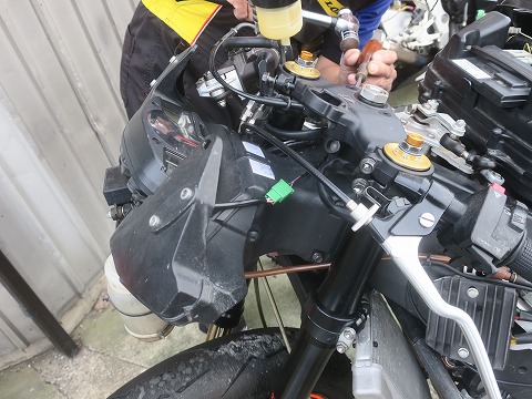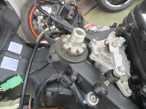 14:10 ステアリング ダンパーを トップブリッジは当然外すので、その前にフロント側とつながっているステアリング ダンパーのネジも外しておきます。 ボルトにワッシャーが入っているんだけど、落っこちやすいので、注意ね。 (自分、落っことして行方不明。 組むときに新しいワッシャを使いました) |