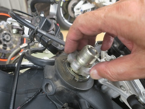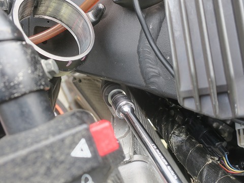 17:05 忘れずに TZのフロントスタンドを架けるために外したラジエータのボルト。 サービス マニュアルには無い項目なので、ラジエータを取付けて締め付けを忘れずに。 |