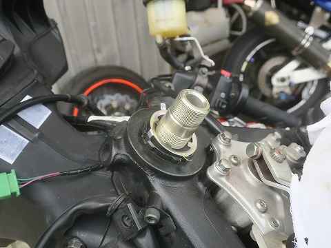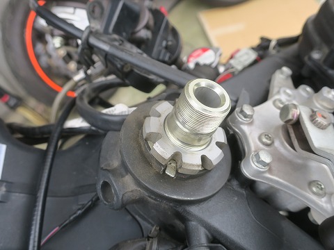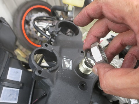14:23 ロック ナットが ステアリング 捨て宇 ナットを外したら、トップブリッジを外します。 トップブリッジを外すとロック ナットが現れます。 |
