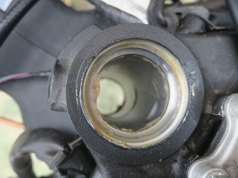 14:34 アウタ レース 三又を抜いたあとのステアリングヘッド。 クリーム色のはグリスで、グリスが付着している銀色のところがベアリングの受け側の部品でアッパ ベアリングのアウタ レースって名前。 上下に1セットづつ付いてます。 |