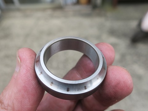 15:02 アウタ レースを こっちは車体側に付くボールベアリングのアウタ レース。 付いていた古い方の部品ですが、こっちにもボールベアリングが当たっていた箇所が磨かれちゃってます。 指で触ってみましたが、ほどんど凹みとかはわかりませんでした。 |