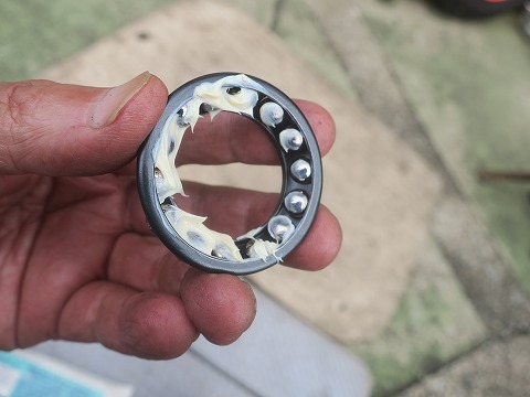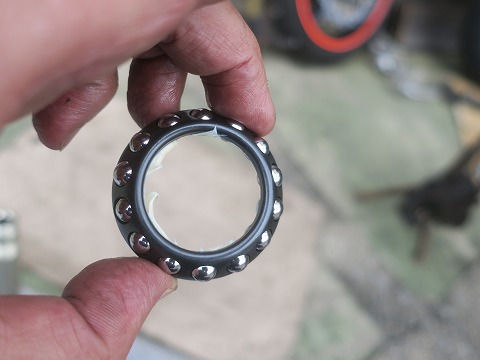 14:35 アジャスト ナットは 外した上下のベアリング。 軽く茶色くなっている箇所がありました。 真ん中の黒い輪っかは、ベアリングを押さえているアジャスト ナット。 このナットの締め付け具合で、ステアリングのベアリングの締め付ける強さを加減する重要な部品だす。 |