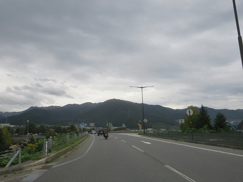 14:06 雨降りそう ツルヤで飲物を仕入れた後、国道403号線に戻り角間温泉を目指し北上します。 正面やや左手が斑尾高原、右手側が志賀高原の山々かな。 これから向かう角間温泉は志賀高原を下りたところで、ちょうど山がくぼんでいるあたりかな。 空模様を見ると、山の上の方は完全に雨っぽいですね。 志賀・草津ルートを走らなくて正解だったでしょう。 天気予報だと、3時から降り始めるみたいなので、宿に急ぎましょう。 |