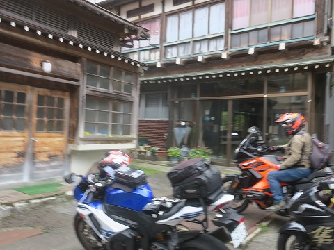 14:38 宿に到着 今日は、MAOHさんとタグロンさんと3人で温泉ツーリング。 天候が崩れる予報が出ていたので、宿には早めにやってきました。 訪れた宿は、湯田中温泉や渋温泉に隣接している角間温泉にある”ようだや旅館”さんです。 角間温泉は、昭和の湯治場の名残りの旅館が数軒と3軒の共同浴場がある温泉地です。 宿に到着しましたが、バイクを駐めるところが分らないので、バイクを停めて宿の人に駐車場の場所を聞きに行きます。 |