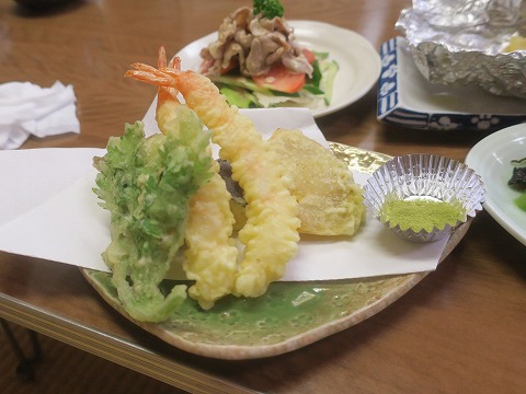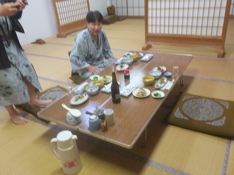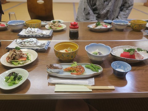 18:05 夕食です 共同浴場の大湯に入ったら、一旦部屋でくつろいで、落ち着いたら宿の大風呂に。 温泉で汗をかいたら、部屋に戻ってビールで水分補給。 夕食の時間までまったり過ごしました。 6時になって夕食の時間になりました。 食事は大広間で。 他のお客さんは2組くらい居たのかな。 |