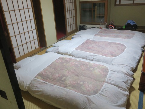 19:11 部屋に戻ると 食事を終えて部屋に戻ると、フトンが敷かれていました。 フトンはセルフかと思っていたので、ちょっとうれしい。。 まあ、民宿じゃなくて旅館ですから。 部屋が12畳と大き目でよかったです。 フトンが敷いてあっても、座卓で飲めましたから。 |