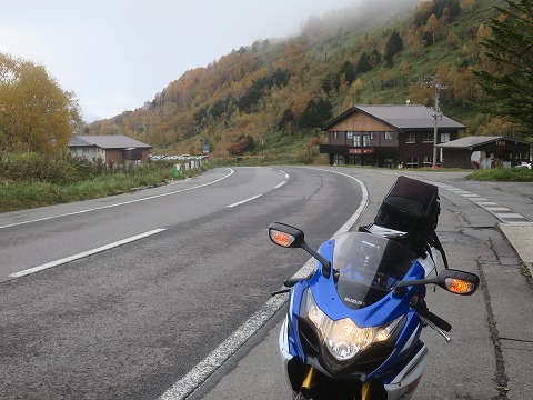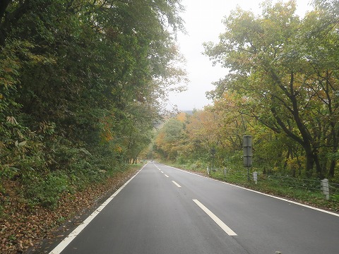 9:28 国道292号線を上る 国道292号線に入り、まずは志賀高原・横手山方面を目指して西走します。 最初、乾いていた路面も途中からウェットに。 雨は降ってないので、そのまま進みます。 標高を上げるにつれ、紅葉している木々もあって、曇っていますが景色を楽しめます。 濡れた葉っぱも悪くはありません。 まだ午前中なので交通量は少なめ。 ただ、路面がウェットなので、快適とは言えませんし、クルマに追い付いても抜きにくいですね。 |