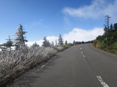 9:47 横手山ドライブインに 国道292号線で標高を上げると、途中から霧じゃないか”雲”の中に入り、そのまま山を登り続け、標高2,100mにある横手山ドライブインまでやってきました。 「むっちゃ寒。」 看板の足元を見ると、草に霧氷が付着しています。 ここは氷点下だね。 この辺りは気温が低いのはわかっていたんで、防寒服を持ってきたんですが、予想越える寒さですね。 昨日と2日のあいだで温度差25℃はこたえますね。 辺りは雲の中で視界が効きません。 視界30mくらいかな。 ここに居ても寒いだけなので、先に進みます。 (ここまで来たら、もう引き返せないぞ)(笑) |