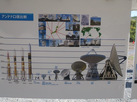 14:09 大きさ比較 臼田の方が大きい。 けど、美笹のはアンテナに裏があって、宇宙からの電波にノイズが乗らないように液体ヘリウムで冷却している。って話だったかな。(不確か) なので、臼田のより重い。 その他、左の方にはHU型とかHV型とかのロケットの大きさ比較も書いてあります。 比較してみると、パラボラアンテナってデカいな。 臼田のアンテナもこの近くにあって、今回は行きませんでしたが、見ることができるそうな。 |