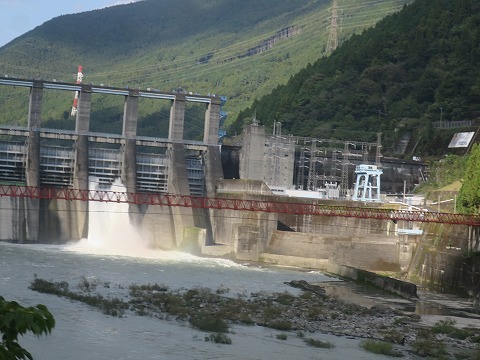 14:43 秋葉ダムは ついでに国道から秋葉ダムが見えたので、写真に撮っておこう。 結構な勢いで水を放流していますが、上の写真だと秋葉湖の水面は流れがわからないほど静かで平面です。 |