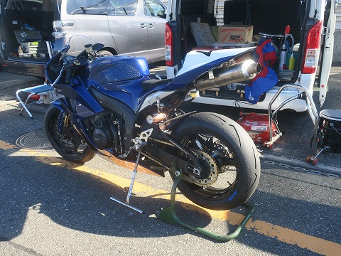 9:28 今日の2本目は 今日は練習走行に2箇月ぶりに筑波サーキットに来ています。 1本目の走行が終わり、2本目は9時40分からです。 走行10分前になったので、エアー圧の確認などを始めます。 5分前になったら、エンジンをかけて暖気を開始します。 |