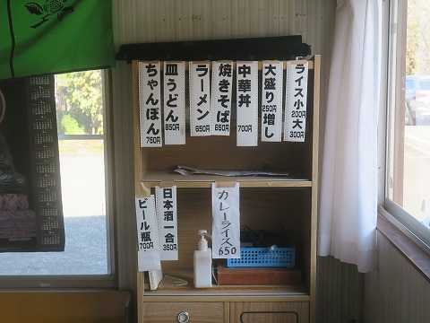 11:22 注文は 店内に入ると、正面がカウンターで6席、右手が4人ほど座れる小上がりになっている小ぢんまりとしたお店です。 カウンターに座って、お品書きは・・・・。 無くて、食器棚に貼ってあるだけ。(笑) 注文は、左上の”ちゃんぽん”で。 大盛りは・・・・。 店の感じと追加の金額からすると、大盛りは1.5玉じゃなくて、2玉になりそうなので、止めておきました。(笑) |