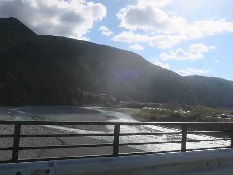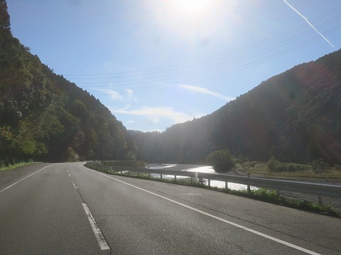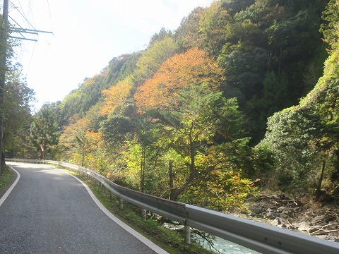12:57 杉川沿いに センタラインのある区間をしばし走ると、ふたたびセンタラインなしの1.5車線の区間に。 右手に流れているのは天竜川の支流の杉川。 周囲には、時期的にちょっと早い様ですが、紅葉している木も見られます。 この辺りは、景色を眺めて走るのも良し、走りに集中するも良し、の区間です。 |