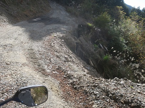 12:25 崩壊 先に進むと、砂利道の路面は荒れ荒れ。 崩壊している場所は(たぶん)ここだな。 クルマ(四輪車)の轍のすぐ横から崩壊しています。 重量の重いクルマが走ったら崩れるね。 轍もかなり深く掘れているので、普通の乗用車だと腹を擦って走破できないでしょう。 恐るべし、google mapのルート案内。(爆) googleのルート案内を信じてここまで走ってきたクルマのドライバーは泣くね。 久しぶりの、酷道、険道ですね。 林道だけど・・・・。 ちなみに、(無事)自宅に戻ってから google mapを調べたけど、この区間のストリート ビューはありませんでした。(笑) |