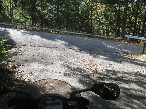 12:14 ビッチリ落葉 ずんずん先に進みます。 季節がら路面は落葉でビッチリ。 クルマは全然走っていませんが、飛ばせませんね。(笑) のんびり走行で先に進みます。 |