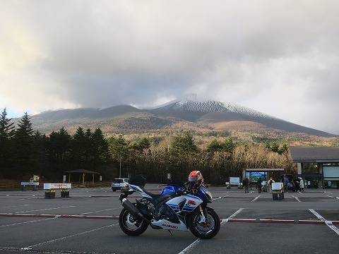 15:29 富士山スカイラインで 県道180号線(富士山スカイライン)を東進、そのまま県道152号富士公園太郎坊線に入り、御殿場方向に進みます。 表冨士の5合目に向かう交差点から2kmほど走り、途中にある水ヶ塚(みずがづか)公園で駐まります。 寒い。 富士山をバックに写真を撮りましたが、雲が掛かっちゃってて残念。 この辺りは標高1500m程度。 バイクに付けてある温度計は2℃まで下がりました。 途中の路面も乾いていない部分もあって、凍結を心配しましたが、大丈夫でした。 11月末にバイクでこの路線を走るのはリスキーですね。 |
