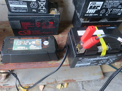 16:00 充電完了 夕方まで充電して、充電完了。 完了時の電圧は、受電前よりちょっと上がって13.12V。 後ろに使えないバッテリーとか、使えるバッテリーが貯まりましたね。(笑) |