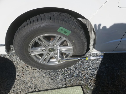 11:02 トルクレンチで 右前が終わったら、右後ろ。 この写真はスタッドレスに交換済でトルクレンチで締め付けているところ。 |