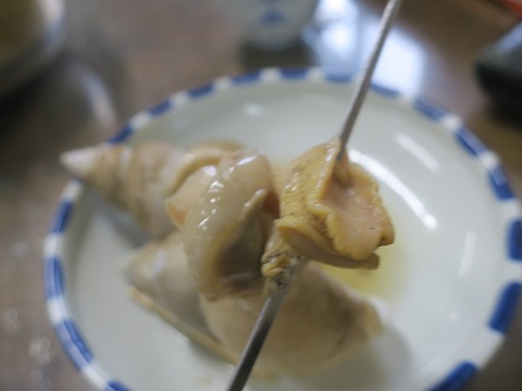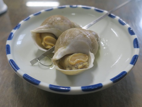 12:38 バイ貝旨し たら汁を食べながら、バイ貝をつまみます。 醤油ベースで甘辛い味付けのバイ貝は旨し。 2つじゃ物足らないけど、お値段がね。 これをつまみに日本酒なぞやったら、最高でしょう。 |