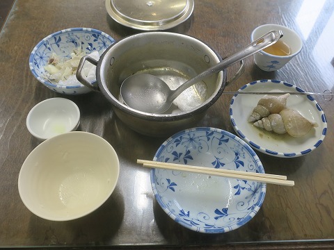12:31 タラ汁登場 バイ貝を食べようとしていたら、アルマイトの鍋に入れられた たら汁が運ばれてきました。 座敷童は居ませんが、取り皿は2つ。 一つは、骨入れですね。 鍋の大きさは、20センチくらい。 一人で食べるにはたっぷり過ぎます。(笑) |