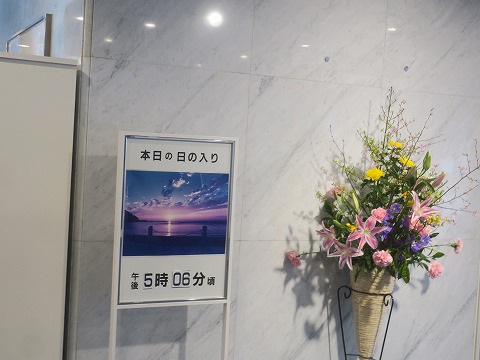15:36 日の入り時刻 ホテル内に入り、まずはチェックイン。 ロビーには本日の日の入り時刻が掲示してあります。 西伊豆に位置する松崎は、駿河湾に沈む夕日がきれいなところです。 ホテルとしても、駿河湾に沈む夕日を売りにしています。 |